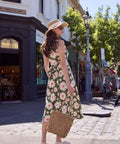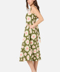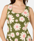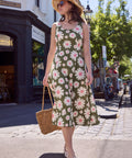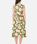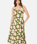 Olive green retro floral midi dress featuring a bold 60’s-style daisy print in cool mid-century tones.