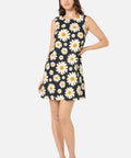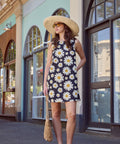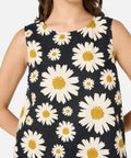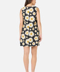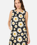 Black retro floral shift dress featuring a bold 60’s-style daisy print in cool mid-century tones.