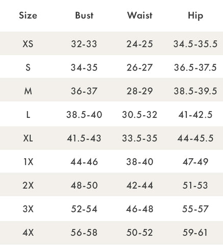 Model Measurements: Height 68/Bust 34"/Waist 24"/Hips 36"